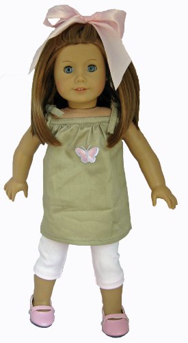 - Includes: Beige Sundress witrh shoulder ties and butterfly applique. Pink Leggings included and Pink Ballet Flats.- Doll and Bow Not Included- Outfit fits 18" American Girl Doll- View all products available at Red Truck Doll Clothes. Thank you for shopping with us.- Visit us at www.redtruckdollclothes.com
